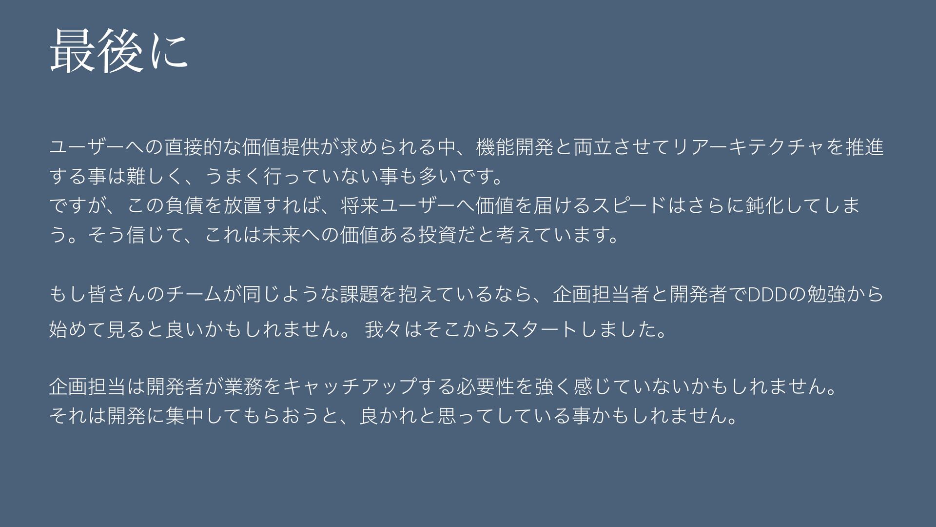 ࠷ޙʹ ϢʔβʔͷతͳՁఏڙ͕ٻΊΒΕΔதɺػೳ։ൃͱཱ྆ͤͯ͞ϦΞʔΩςΫνϟΛਪਐ ͢Δࣄ͘͠ɺ͏·͘ߦ͍ͬͯͳ͍ࣄଟ͍Ͱ͢ɻ Ͱ͕͢ɺ͜ͷෛ࠴Λ์ஔ͢ΕɺকདྷϢʔβʔՁΛಧ͚Δεϐʔυ͞ΒʹಷԽͯ͠͠· ͏ɻͦ͏৴ͯ͡ɺ͜ΕະདྷͷՁ͋Δࢿͩͱߟ͍͑ͯ·͢ɻ ͠օ͞ΜͷνʔϜ͕ಉ͡Α͏ͳ՝Λ๊͍͑ͯΔͳΒɺاը୲ऀͱ։ൃऀͰDDDͷษڧ͔Β ࢝ΊͯݟΔͱྑ͍͔͠Ε·ͤΜɻ զʑ͔ͦ͜Βελʔτ͠·ͨ͠ɻ اը୲։ൃऀ͕ۀΛΩϟονΞοϓ͢ΔඞཁੑΛڧ͘ײ͍ͯ͡ͳ͍͔͠Ε·ͤΜɻ ͦΕ։ൃʹूதͯ͠Β͓͏ͱɺྑ͔Εͱࢥ͍ͬͯͯ͠Δࣄ͔͠Ε·ͤΜɻ
