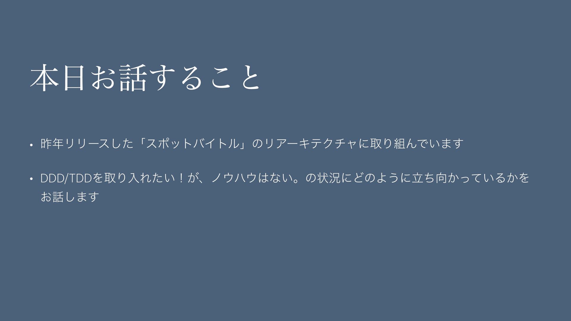 ຊ͓͢Δ͜ͱ • ࡢϦϦʔεͨ͠ʮεϙοτόΠτϧʯͷϦΞʔΩςΫνϟʹऔΓΜͰ͍·͢ • DDD/TDDΛऔΓೖΕ͍ͨʂ͕ɺϊϋͳ͍ɻͷঢ়گʹͲͷΑ͏ʹཱ͔͍ͪͬͯΔ͔Λ ͓͠·͢