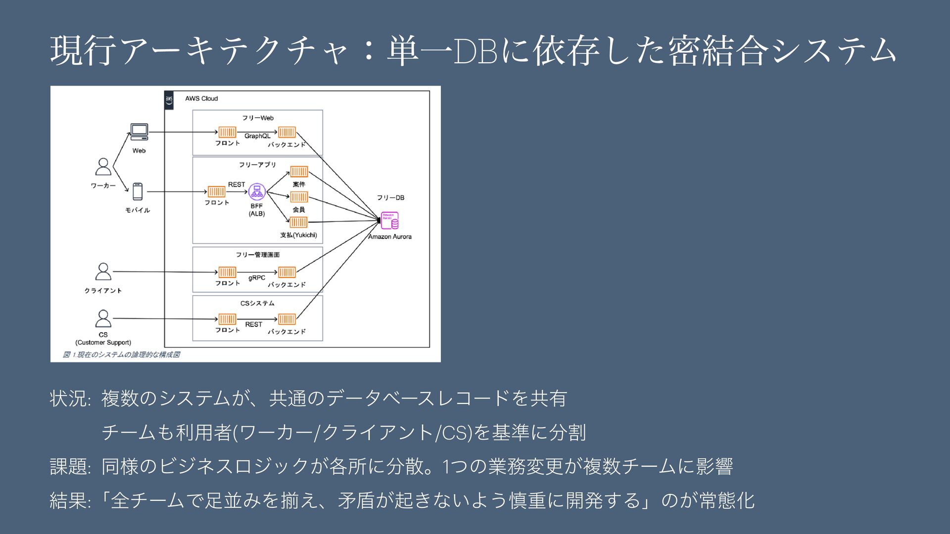 ݱߦΞʔΩςΫνϟɿ୯ҰDBʹґଘͨ͠ີ݁߹γεςϜ ঢ়گ: ෳͷγεςϜ͕ɺڞ௨ͷσʔλϕʔεϨίʔυΛڞ༗ νʔϜར༻ऀ(ϫʔΧʔ/ΫϥΠΞϯτ/CS)Λج४ʹׂ ՝: ಉ༷ͷϏδωεϩδοΫ͕֤ॴʹࢄɻ1ͭͷۀมߋ͕ෳνʔϜʹӨڹ ݁Ռ:ʮશνʔϜͰฒΈΛἧ͑ɺໃ६͕ى͖ͳ͍Α͏৻ॏʹ։ൃ͢Δʯͷ͕ৗଶԽ