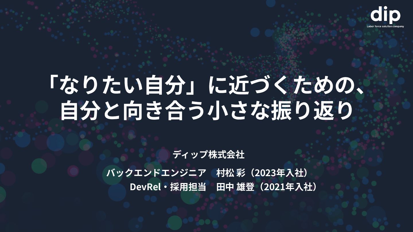 「なりたい⾃分」に近づくための、 ⾃分と向き合う⼩さな振り返り ディップ株式会社 バックエンドエンジニア DevRel‧採⽤担当 村松 彩(2023年⼊社) ⽥中 雄登(2021年⼊社)