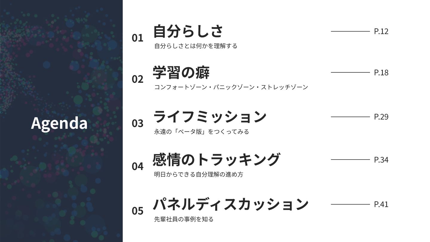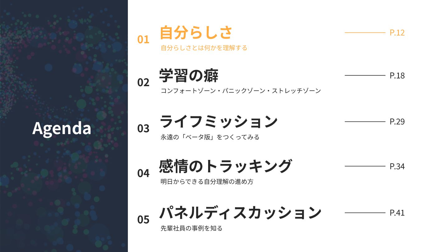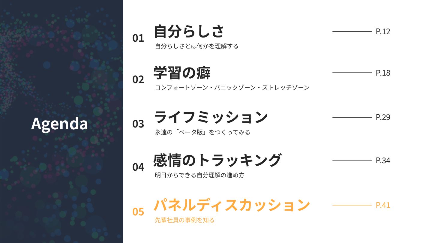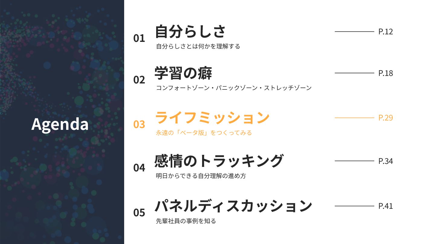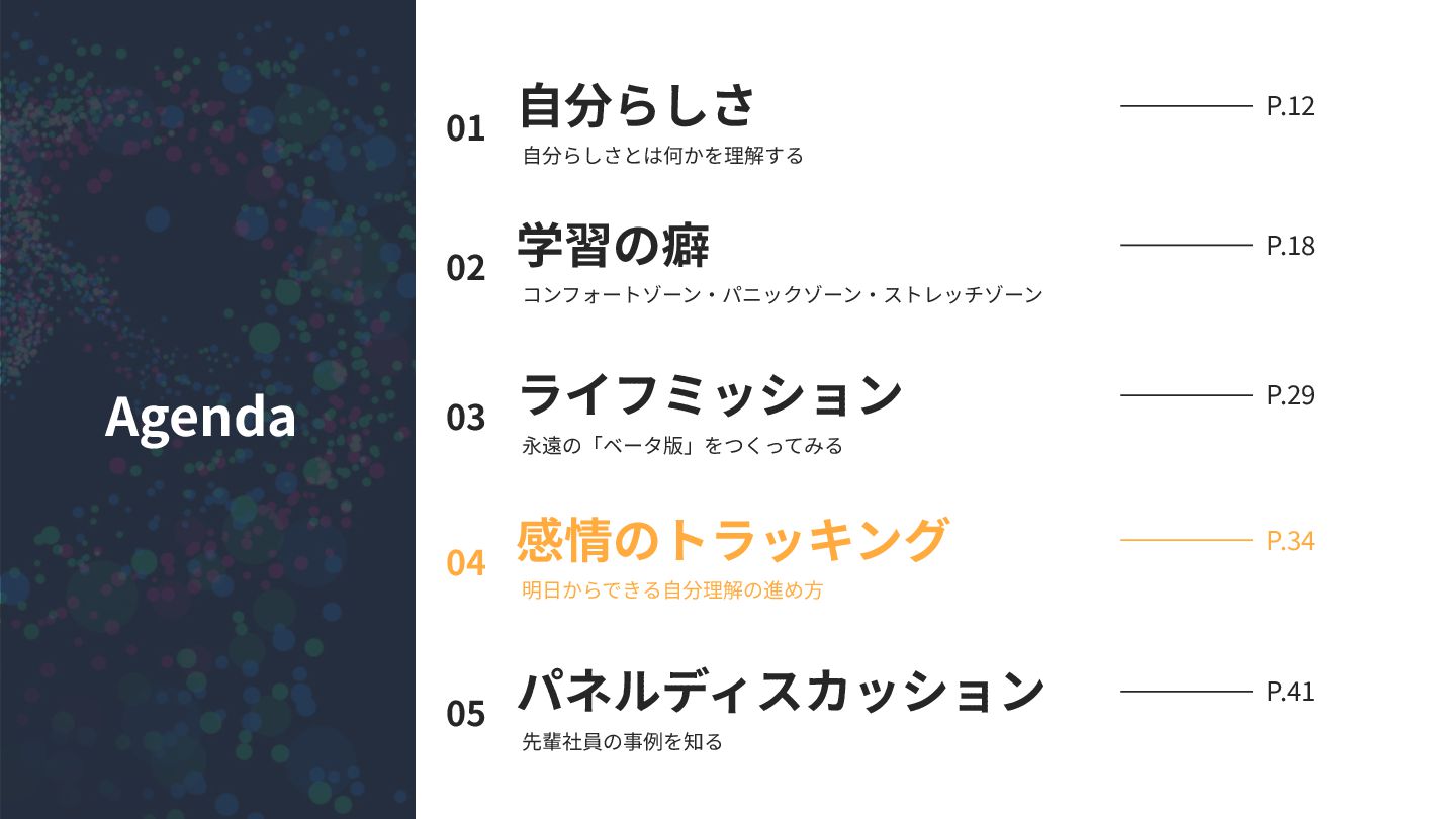ライフミッション P.29 明⽇からできる⾃分理解の進め⽅ 04 感情のトラッキング P.34 先輩社員の事例を知る 05 パネルディスカッション P.41 Agenda