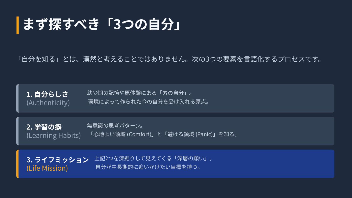 Habits) 無意識の思考パターン。 「⼼地よい領域 (Comfort)」と「避ける領域 (Panic)」を知る。 3. ライフミッション (Life Mission) 上記2つを深掘りして⾒えてくる「深層の願い」。 ⾃分が中⻑期的に追いかけたい⽬標を持つ。