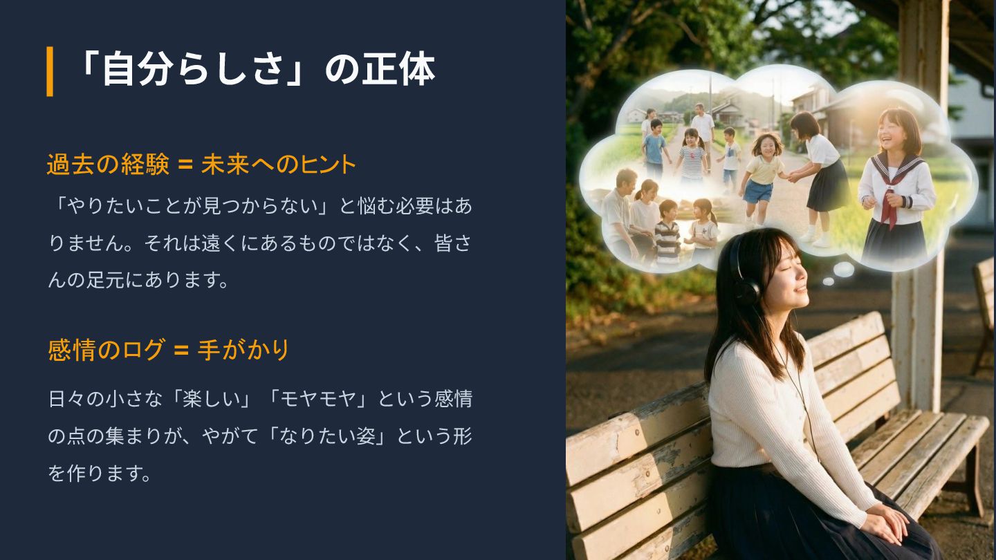 「⾃分らしさ」の正体 「やりたいことが⾒つからない」と悩む必要はあ りません。それは遠くにあるものではなく、皆さ んの⾜元にあります。 感情のログ = 手がかり ⽇々の⼩さな「楽しい」「モヤモヤ」という感情 の点を集めて客観視することで、やがて「なりた い姿」という形を作ります。