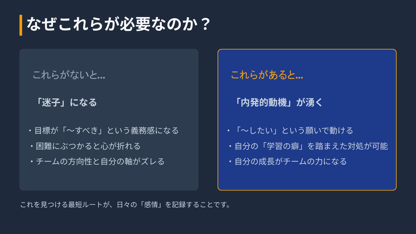 なぜこれらが必要なのか? これを⾒つける最短ルートが、⽇々の「感情」を記録することです。 これらがないと... 「迷⼦」になる ‧⽬標が「〜すべき」という義務感になる ‧困難にぶつかると⼼が折れる ‧チームの⽅向性と⾃分の軸がズレる これらがあると... 「内発的動機」が湧く ‧「〜したい」という願いで動ける