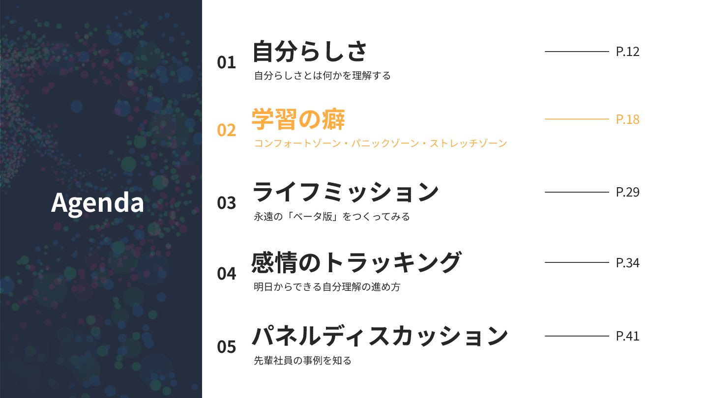 ⾃分らしさとは何かを理解する 01 ⾃分らしさ P.12 コンフォートゾーン‧パニックゾーン‧ストレッチゾーン 02 学習の癖 P.18 永遠の「ベータ版」をつくってみる 03