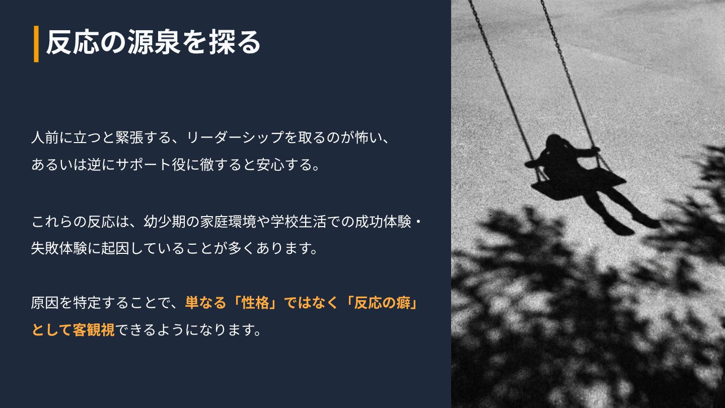 反応の源泉を探る ⼈前に⽴つと緊張する、リーダーシップを取るのが怖い、 あるいは逆にサポート役に徹すると安⼼する。 これらの反応は、幼少期の家庭環境や学校⽣活での成功体験‧ 失敗体験に起因していることが多くあります。 原因を特定することで、単なる「性格」ではなく「反応の癖」 として客観視できるようになります。