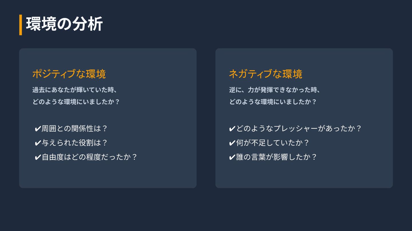 環境の分析 ポジティブな環境 過去にあなたが輝いていた時、 どのような環境にいましたか? ネガティブな環境 逆に、⼒が発揮できなかった時、 どのような環境にいましたか? ✔周囲との関係性は? ✔与えられた役割は? ✔⾃由度はどの程度だったか?