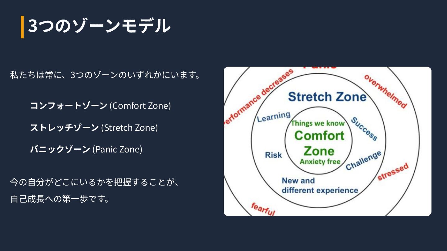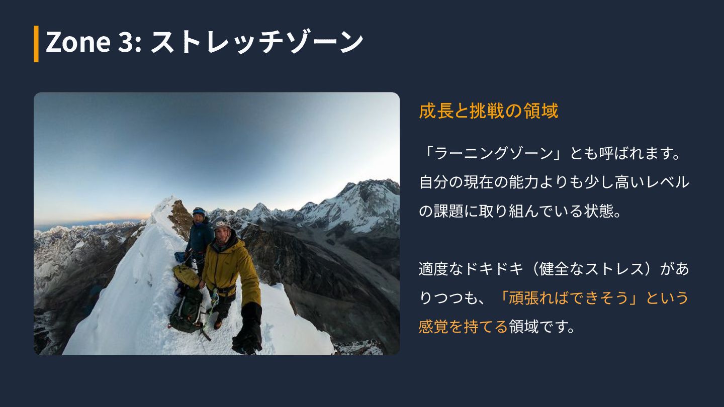 Zone 3: ストレッチゾーン 成長と挑戦の領域 「ラーニングゾーン」とも呼ばれます。 ⾃分の現在の能⼒よりも少し⾼いレベル の課題に取り組んでいる状態。 適度なドキドキ(健全なストレス)があ りつつも、「頑張ればできそう」という 感覚を持てる領域です。