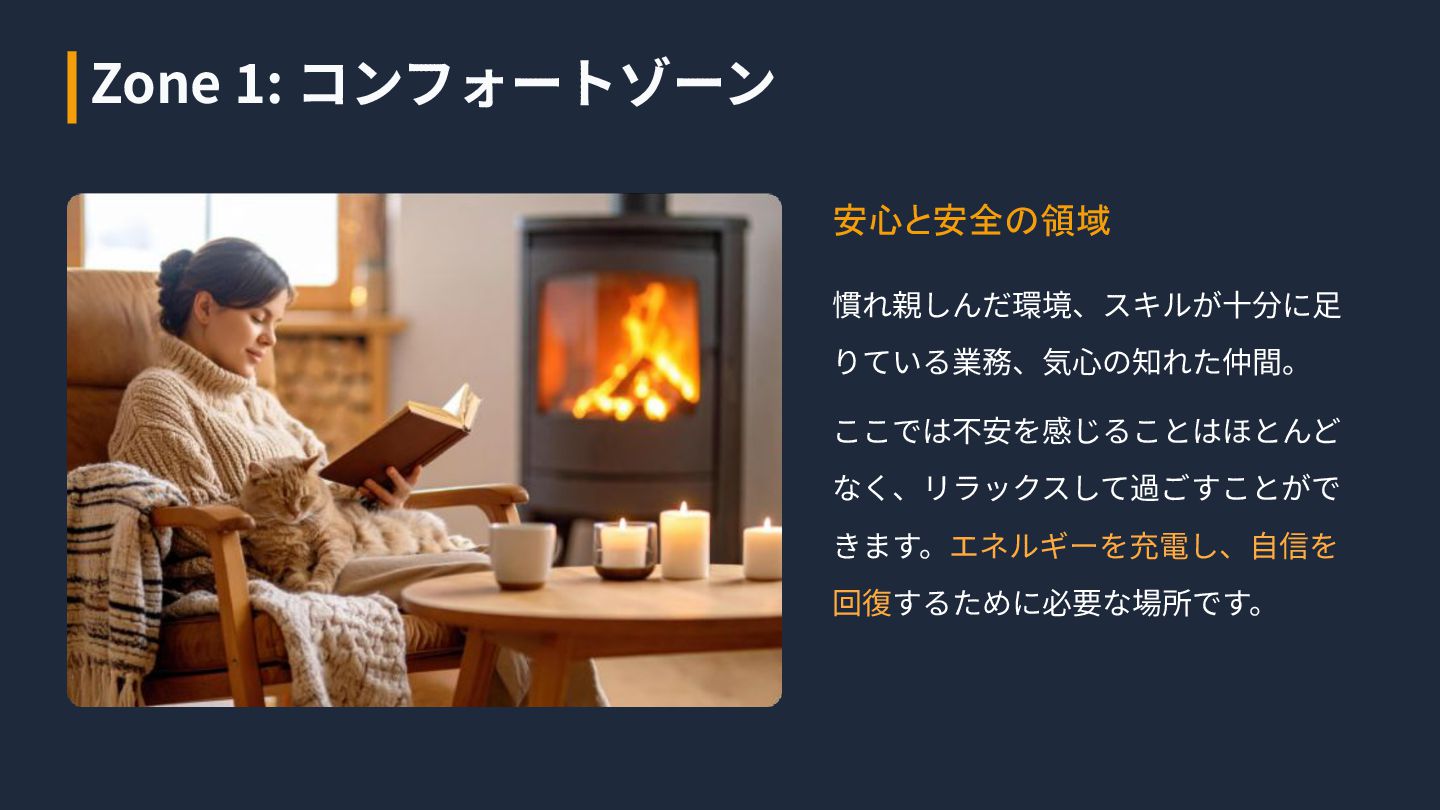 Zone 1: コンフォートゾーン 安心と安全の領域 慣れ親しんだ環境、スキルが⼗分に⾜ りている業務、気⼼の知れた仲間。 ここでは不安を感じることはほとんど なく、リラックスして過ごすことがで きます。エネルギーを充電し、⾃信を 回復するために必要な場所です。