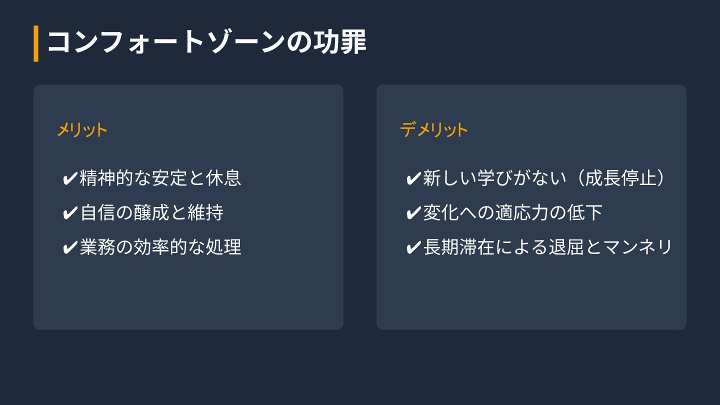 コンフォートゾーンの功罪 メリット デメリット ✔精神的な安定と休息 ✔⾃信の醸成と維持 ✔業務の効率的な処理 ✔新しい学びがない(成⻑停⽌) ✔変化への適応⼒の低下 ✔⻑期滞在による退屈とマンネリ