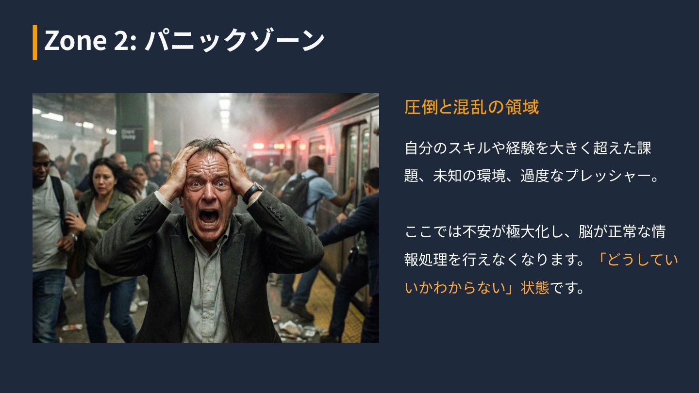 Zone 2: パニックゾーン 圧倒と混乱の領域 ⾃分のスキルや経験を⼤きく超えた課 題、未知の環境、過度なプレッシャー。 ここでは不安が極⼤化し、脳が正常な情 報処理を⾏えなくなります。「どうしてい いかわからない」状態です。