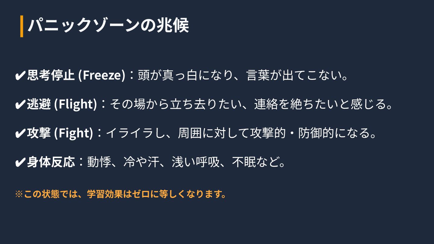 パニックゾーンの兆候 ✔思考停⽌ (Freeze):頭が真っ⽩になり、⾔葉が出てこない。 ✔逃避 (Flight):その場から⽴ち去りたい、連絡を絶ちたいと感じる。 ✔攻撃 (Fight):イライラし、周囲に対して攻撃的‧防御的になる。 ✔⾝体反応:動悸、冷や汗、浅い呼吸、不眠など。 ※この状態では、学習効果はゼロに等しくなります。