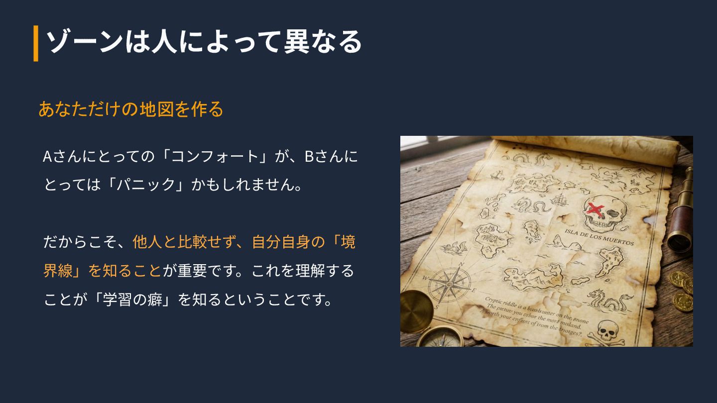 ゾーンは⼈によって異なる あなただけの地図を作る Aさんにとっての「コンフォート」が、Bさんに とっては「パニック」かもしれません。 だからこそ、他⼈と⽐較せず、⾃分⾃⾝の「境 界線」を知ることが重要です。これを理解する ことが「学習の癖」を知るということです。