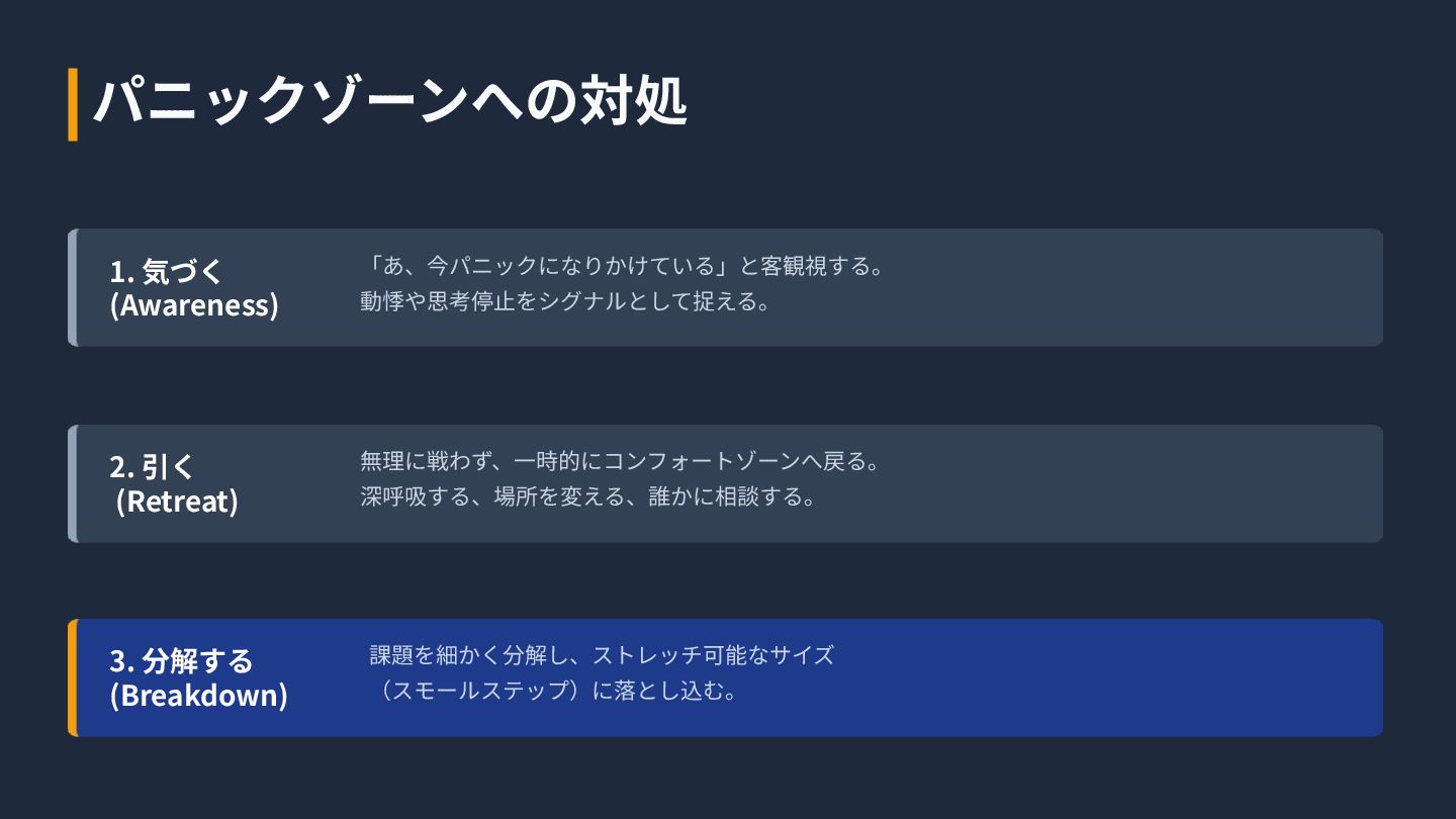 パニックゾーンへの対処 1. 気づく (Awareness) 「あ、今パニックになりかけている」と客観視する。 動悸や思考停⽌をシグナルとして捉える。 2. 引く (Retreat) 無理に戦わず、⼀時的にコンフォートゾーンへ戻る。