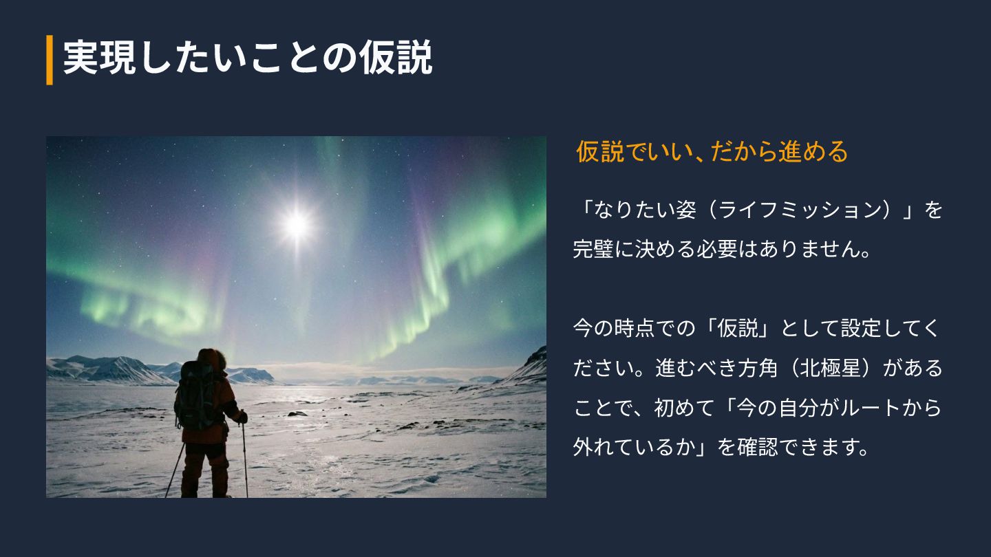 実現したいことの仮説 仮説でいい、だから進める 「なりたい姿(ライフミッション)」を 完璧に決める必要はありません。 今の時点での「仮説」として設定してく ださい。進むべき⽅⾓(北極星)がある ことで、初めて「今の⾃分がルートから 外れているか」を確認できます。