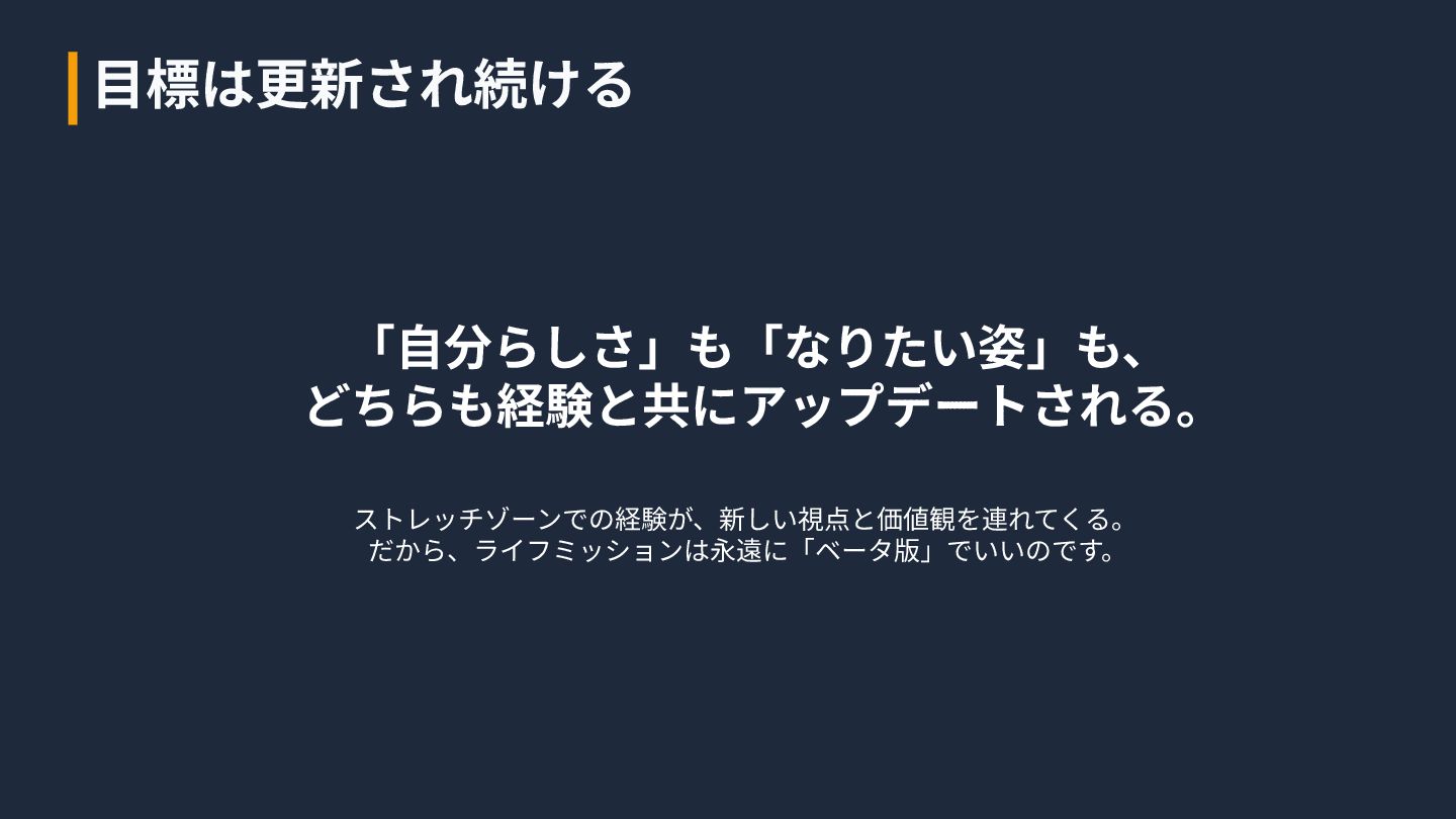 ⽬標は更新され続ける 「⾃分らしさ」も「なりたい姿」も、 どちらも経験と共にアップデートされる。 ストレッチゾーンでの経験が、新しい視点と価値観を連れてくる。 だから、ライフミッションは永遠に「ベータ版」でいいのです。