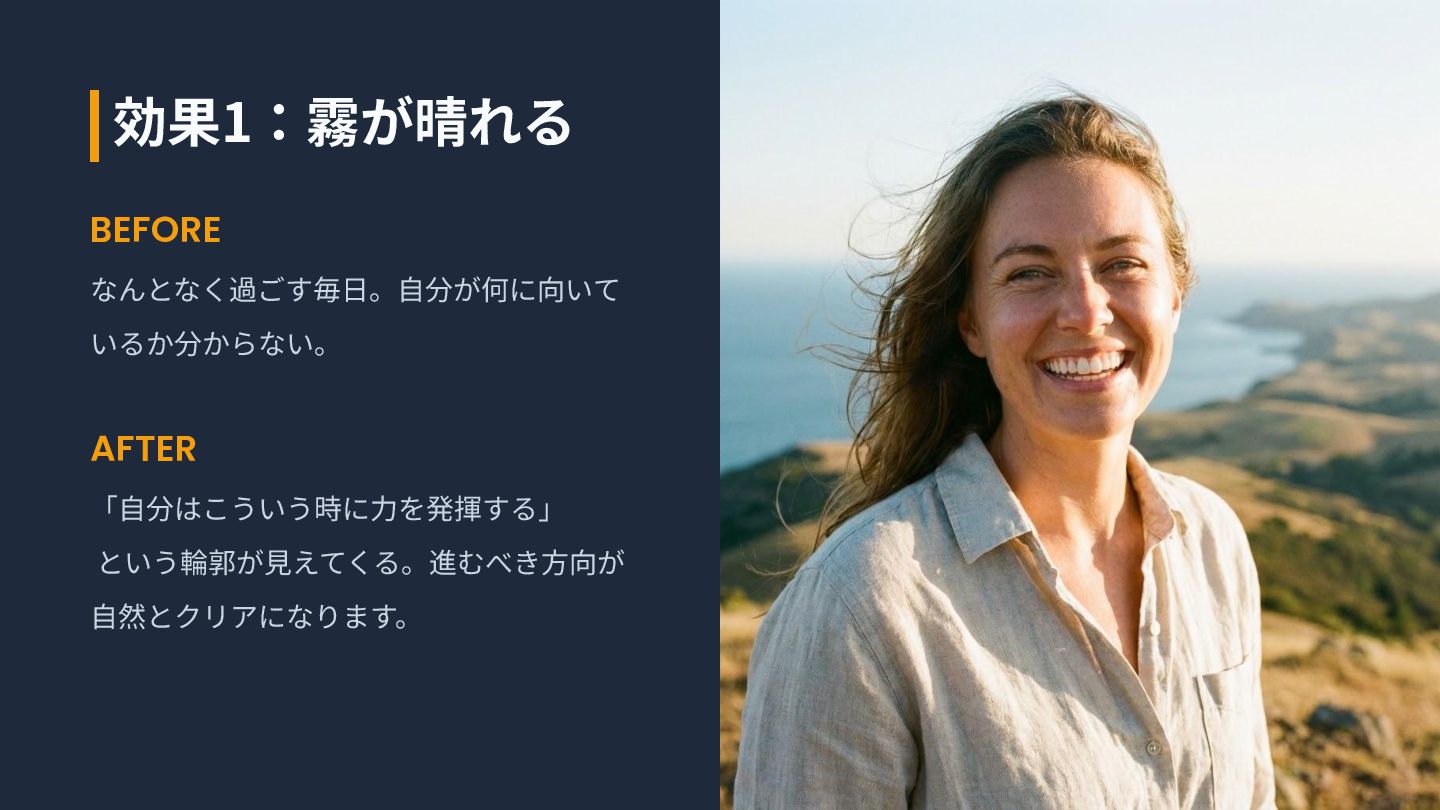 効果1:霧が晴れる BEFORE なんとなく過ごす毎⽇。⾃分が何に向いて いるか分からない。 AFTER 「⾃分はこういう時に⼒を発揮する」 という輪郭が⾒えてくる。進むべき⽅向が ⾃然とクリアになります。