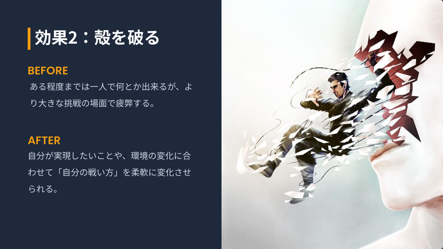 効果2:殻を破る BEFORE ある程度までは⼀⼈で何とか出来るが、よ り⼤きな挑戦の場⾯で疲弊する。 AFTER ⾃分が実現したいことや、環境の変化に合 わせて「⾃分の戦い⽅」を柔軟に変化させ られる。
