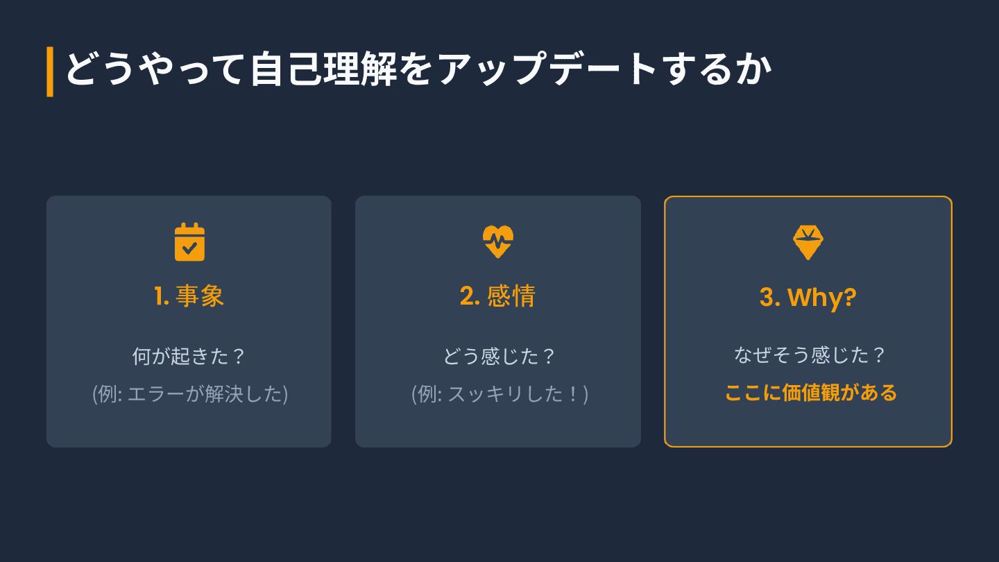 どうやって⾃⼰理解をアップデートするか 1. 事象 何が起きた? (例: エラーが解決した) 2. 感情 どう感じた? (例:
