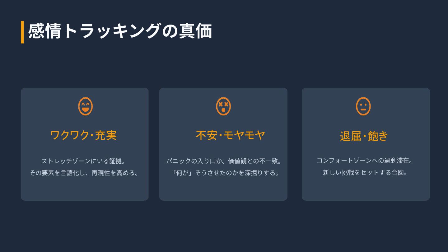感情トラッキングの真価 ワクワク・充実 ストレッチゾーンにいる証拠。 その要素を⾔語化し、再現性を⾼める。 不安・モヤモヤ パニックの⼊り⼝か、価値観との不⼀致。 「何が」そうさせたのかを深掘りする。 退屈・飽き コンフォートゾーンへの過剰滞在。 新しい挑戦をセットする合図。
