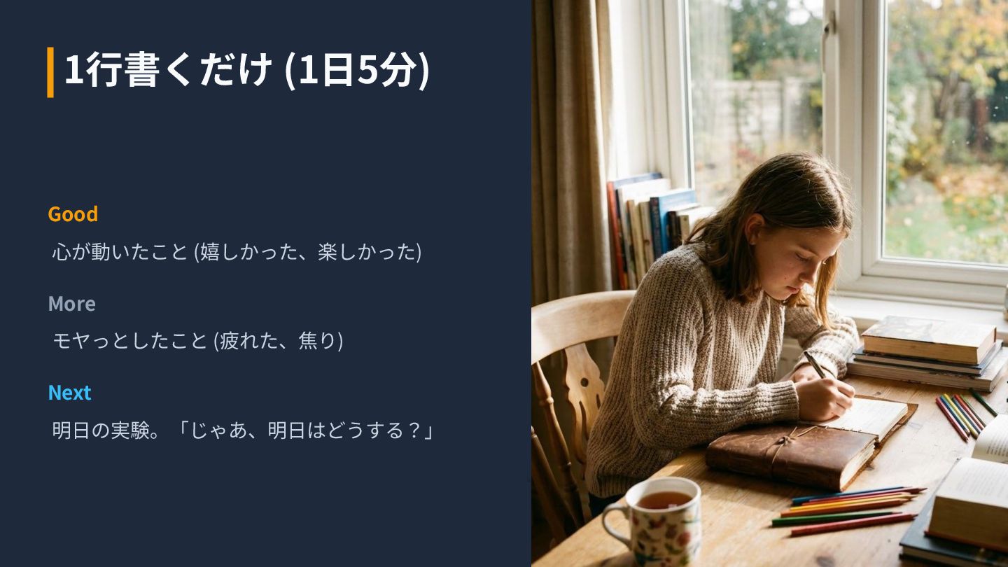 1⾏書くだけ (1⽇5分) Good ⼼が動いたこと (嬉しかった、楽しかった) More モヤっとしたこと (疲れた、焦り) Next 明⽇の実験。「じゃあ、明⽇はどうする?」