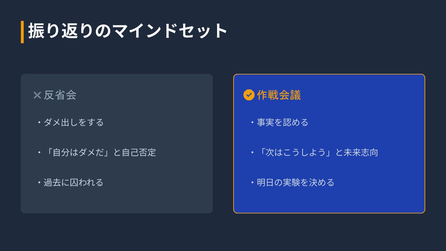 振り返りのマインドセット 反省会 ‧ダメ出しをする ‧「⾃分はダメだ」と⾃⼰否定 ‧過去に囚われる 作戦会議 ‧事実を認める ‧「次はこうしよう」と未来志向 ‧明⽇の実験を決める