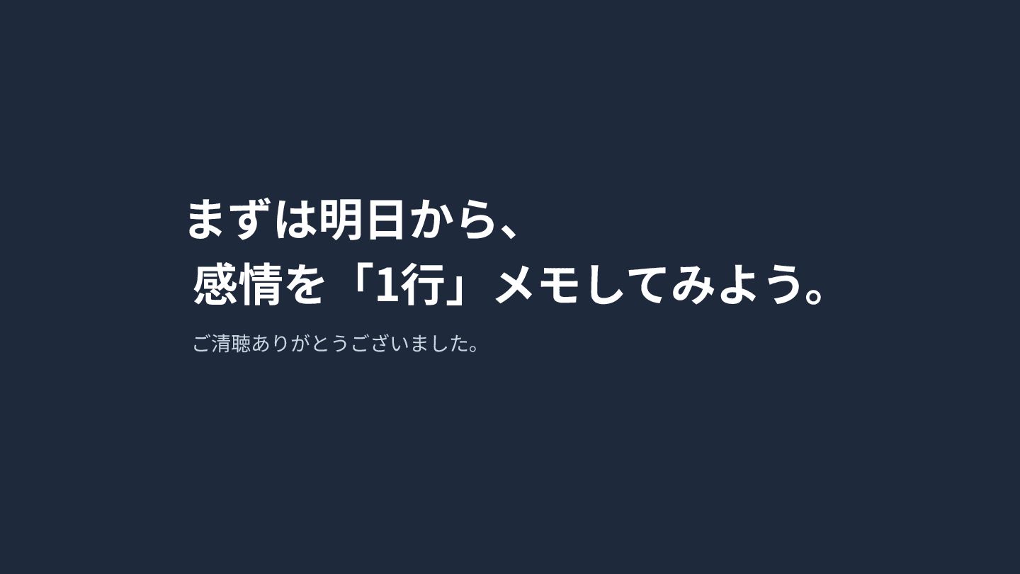 まずは明⽇から、 感情を「1⾏」メモしてみよう。 ご清聴ありがとうございました。