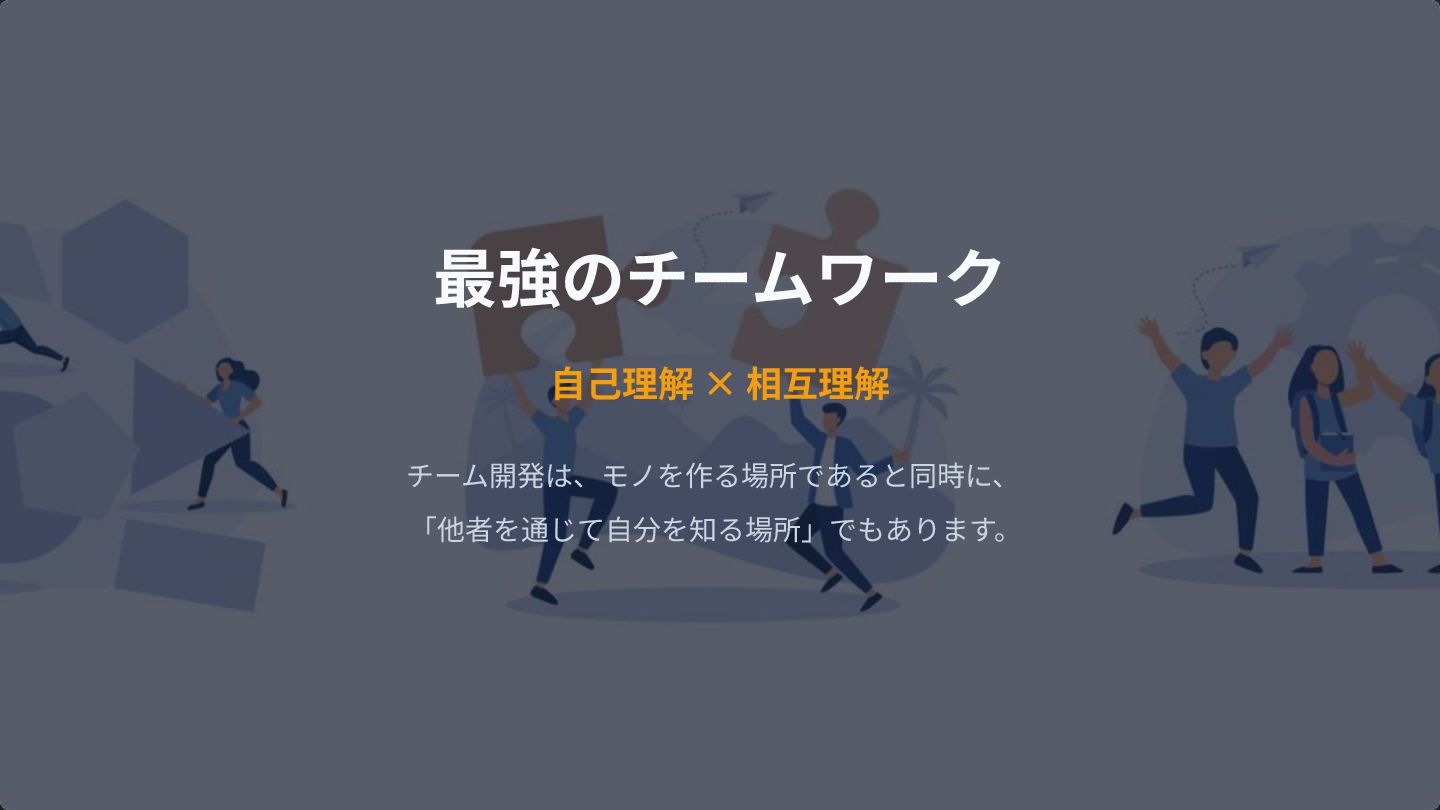 最強のチームワーク ⾃⼰理解 × 相互理解 チーム開発は、モノを作る場所であると同時に、 「他者を通じて⾃分を知る場所」でもあります。