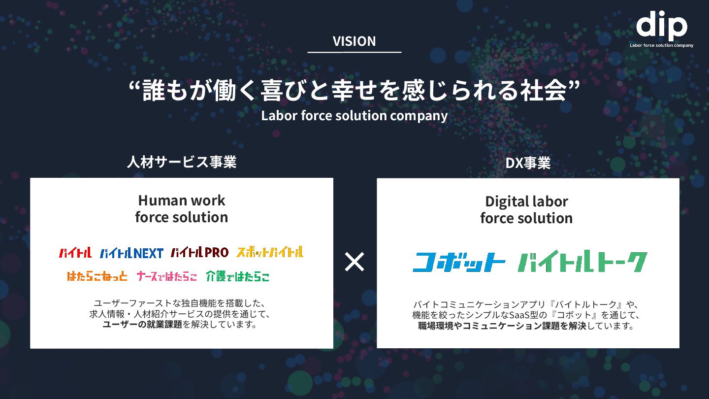 × “誰もが働く喜びと幸せを感じられる社会” Labor force solution company VISION Human work force