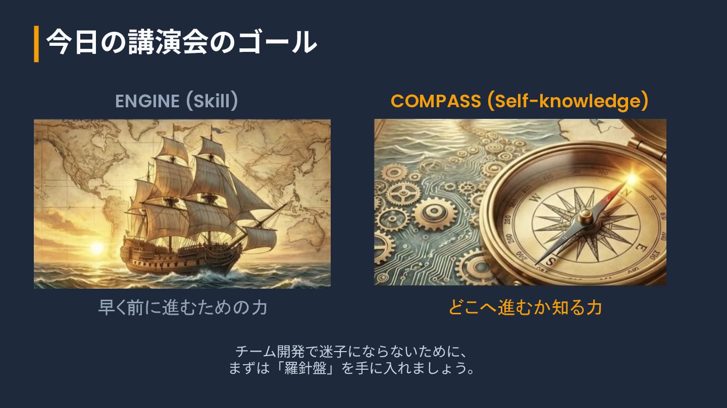 今⽇の講演会のゴール ENGINE (Skill) COMPASS (Self-knowledge) 早く前に進むための力 どこへ進むか知る力 チーム開発で迷⼦にならないために、 まずは「羅針盤」を⼿に⼊れましょう。