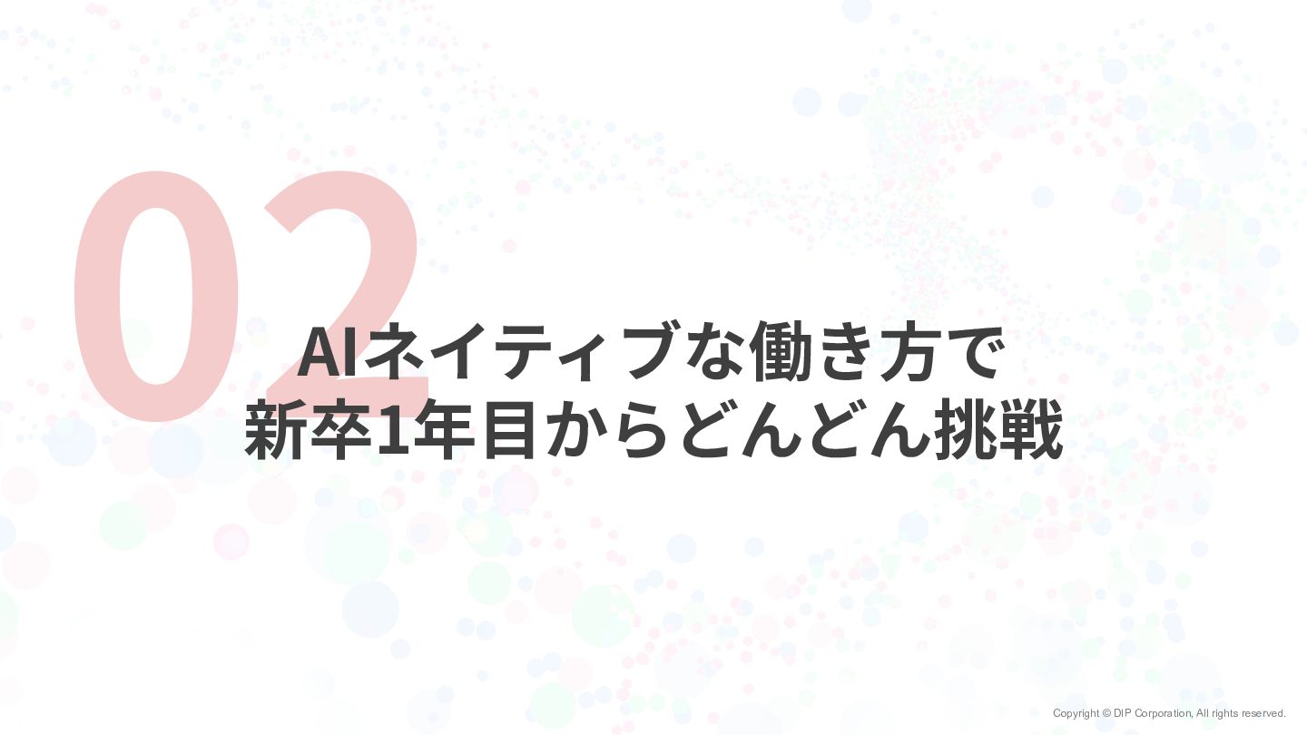 Copyright © DIP Corporation, All rights reserved. 02 AIネイティブな働き⽅で 新卒1年⽬からどんどん挑戦