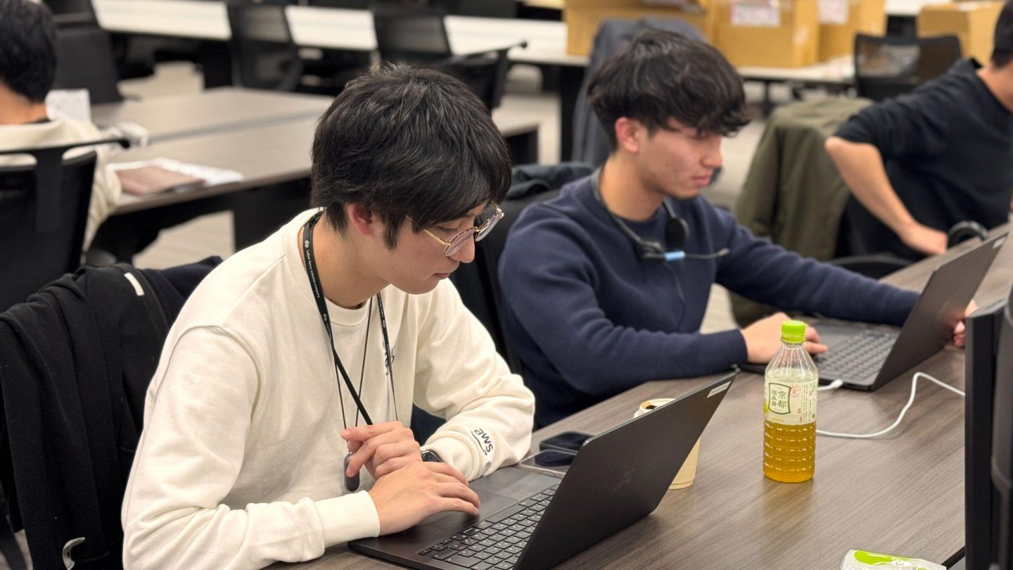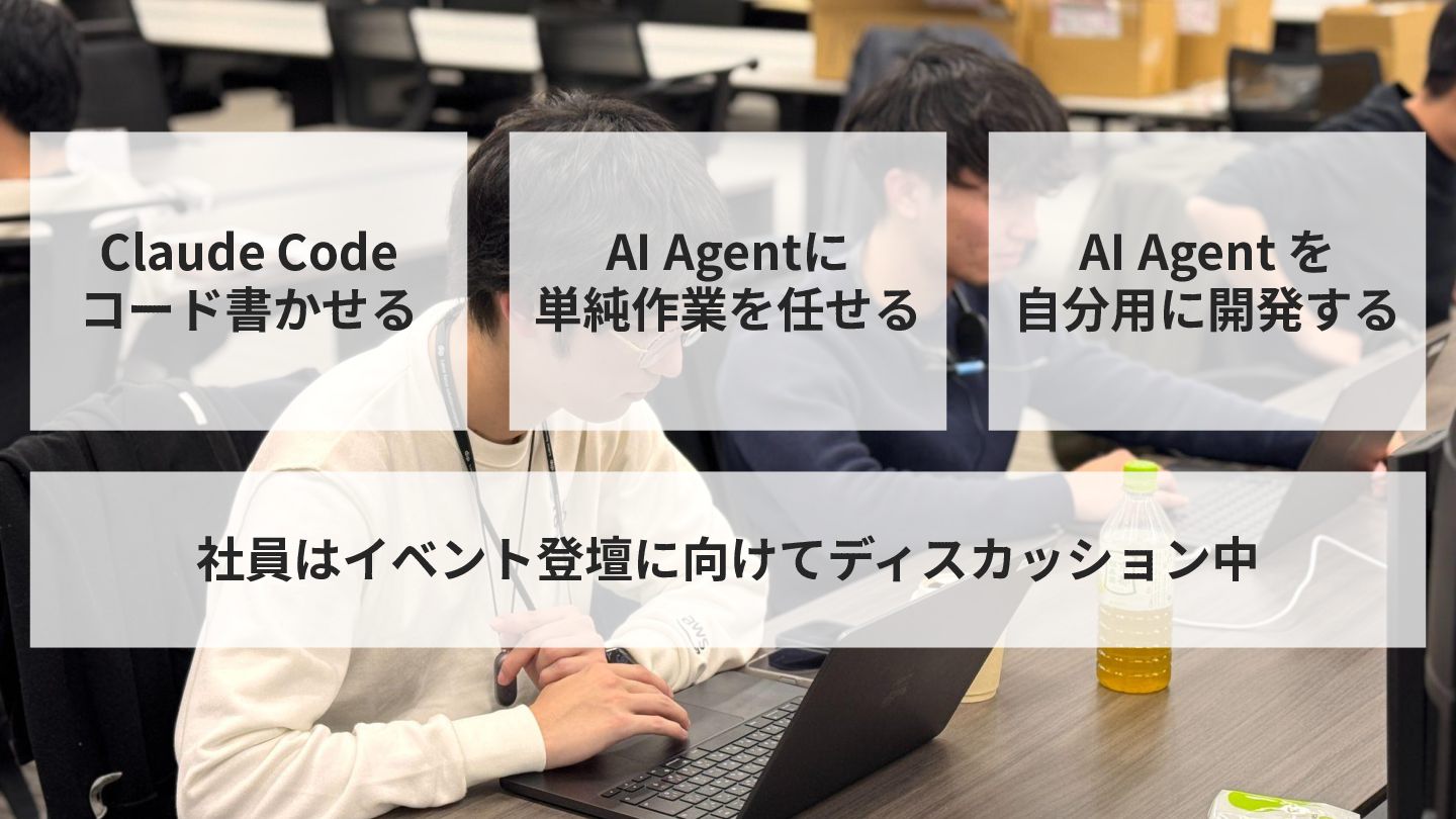 AI Agentに 単純作業を任せる AI Agent を ⾃分⽤に開発する 社員はイベント登壇に向けてディスカッション中