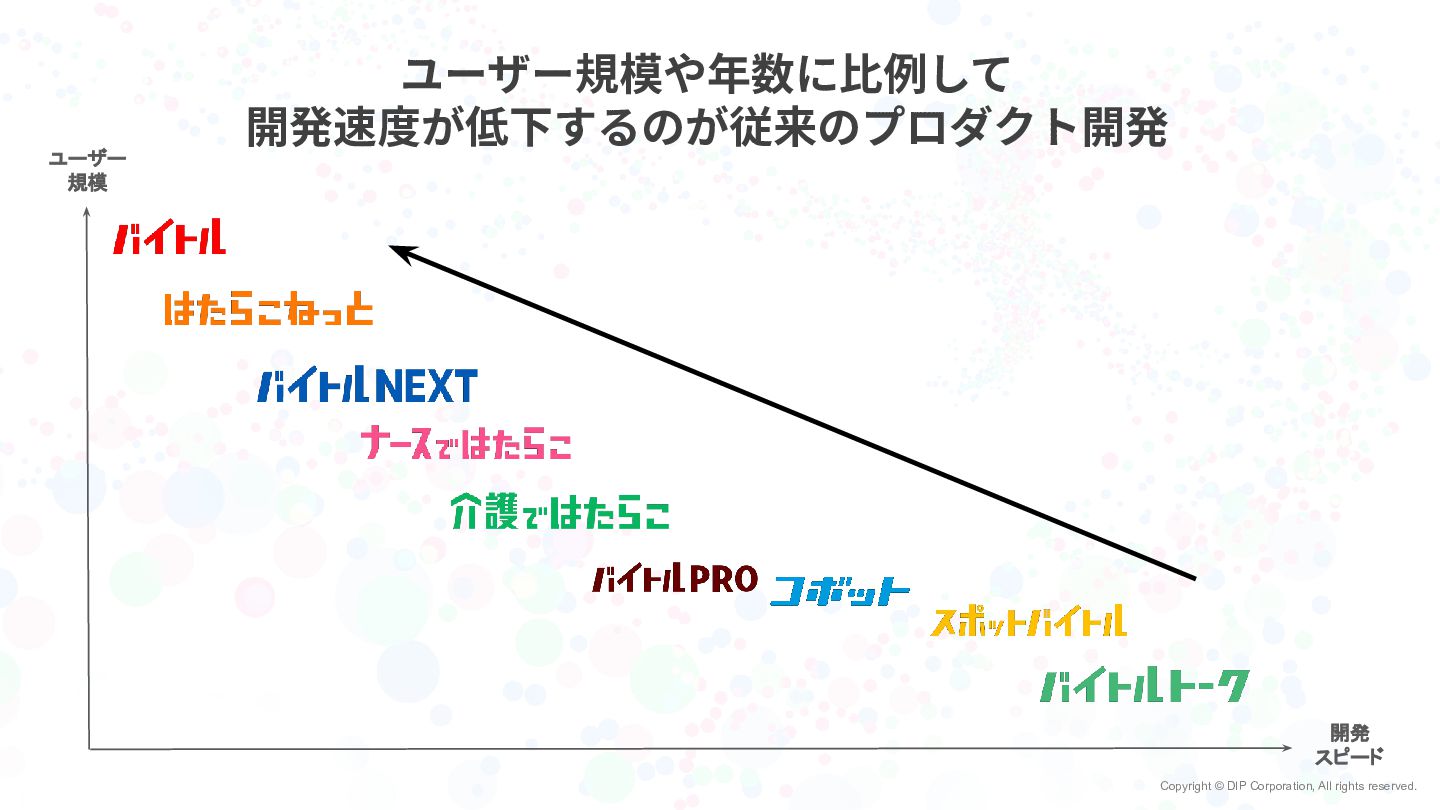 Copyright © DIP Corporation, All rights reserved. ユーザー規模や年数に⽐例して 開発速度が低下するのが従来のプロダクト開発 ユーザー