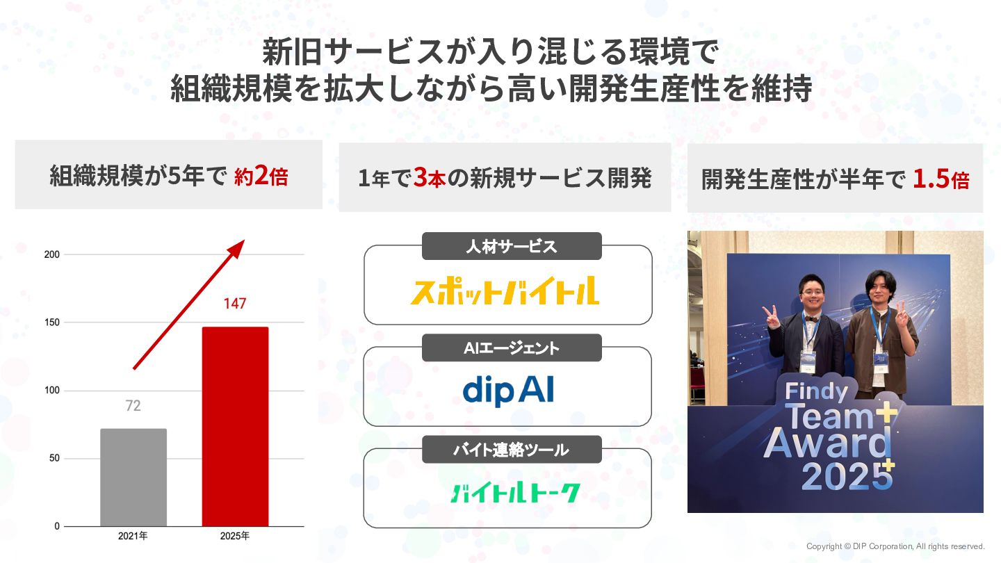 Copyright © DIP Corporation, All rights reserved. 新旧サービスが⼊り混じる環境で 組織規模を拡⼤しながら⾼い開発⽣産性を維持 1年で3本の新規サービス開発