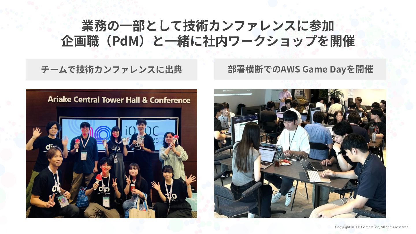 Copyright © DIP Corporation, All rights reserved. 業務の⼀部として技術カンファレンスに参加 企画職(PdM)と⼀緒に社内ワークショップを開催 チームで技術カンファレンスに出典