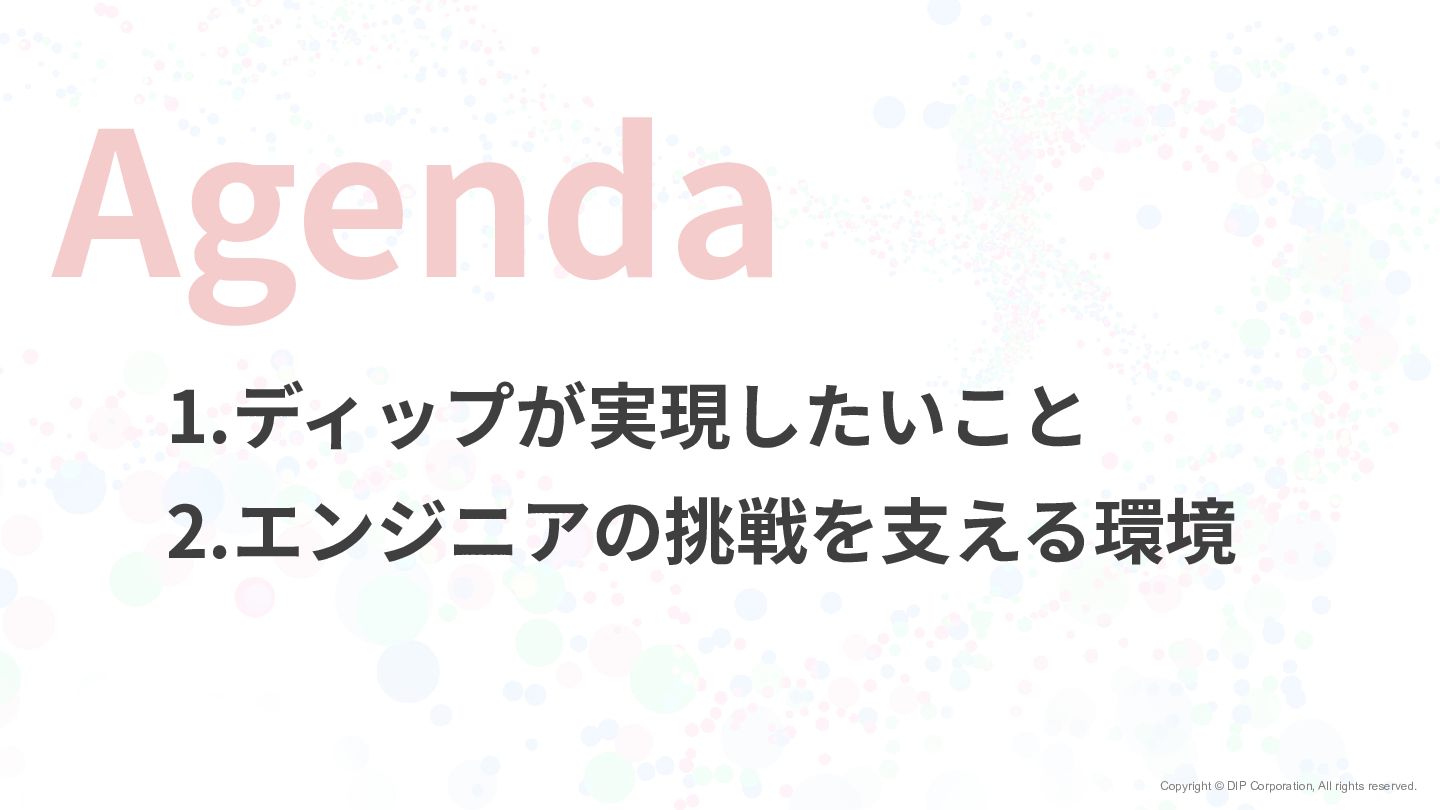 Copyright © DIP Corporation, All rights reserved. Agenda 1.ディップが実現したいこと 2.エンジニアの挑戦を⽀える環境