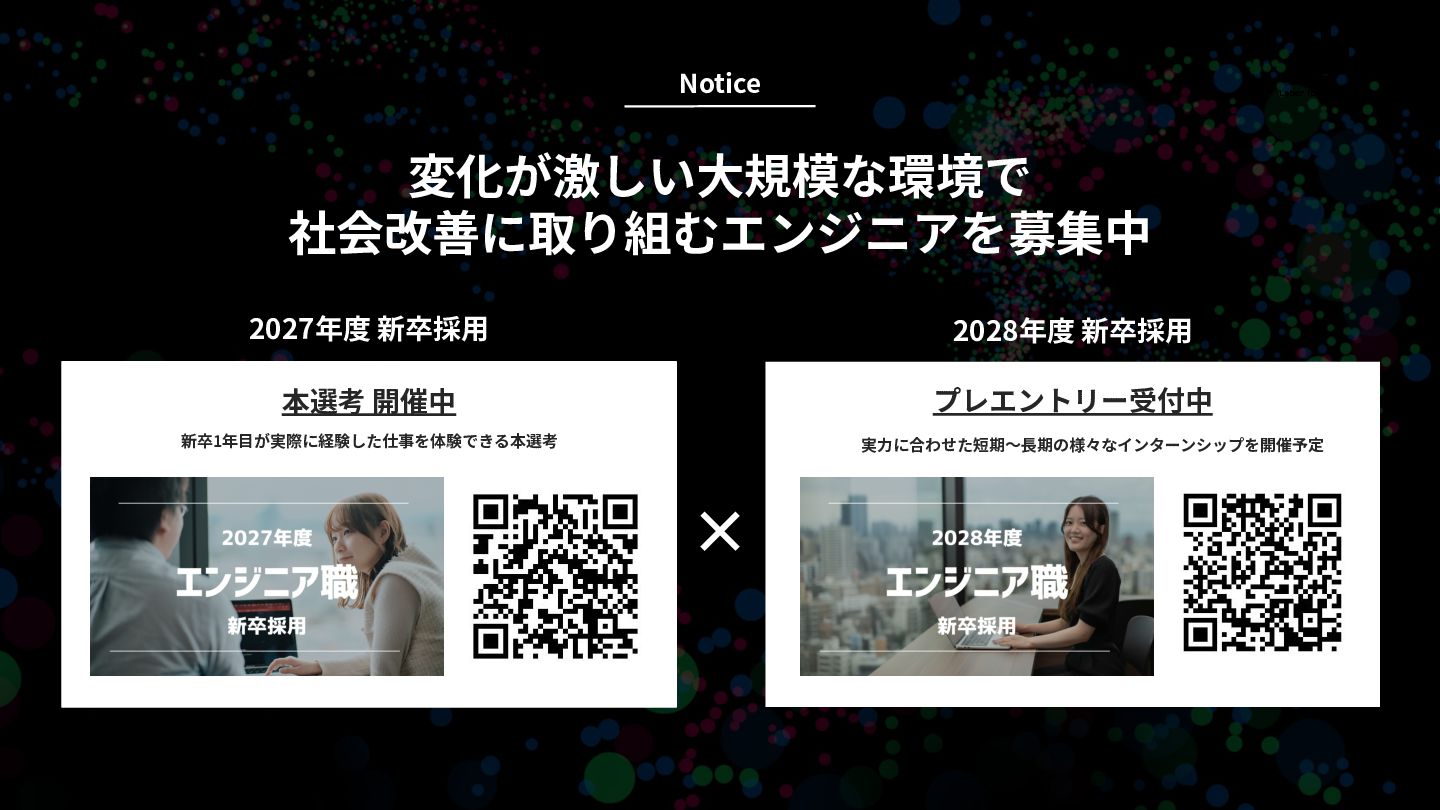 × 変化が激しい⼤規模な環境で 社会改善に取り組むエンジニアを募集中 Notice 本選考 開催中 2027年度 新卒採⽤ プレエントリー受付中 2028年度