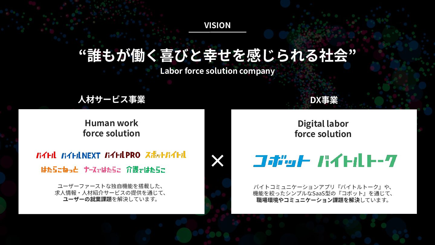 × “誰もが働く喜びと幸せを感じられる社会” Labor force solution company VISION Human work force