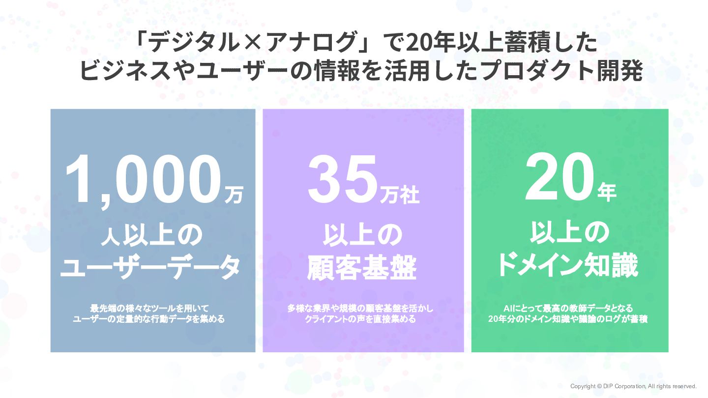 Copyright © DIP Corporation, All rights reserved. 「デジタル×アナログ」で20年以上蓄積した ビジネスやユーザーの情報を活⽤したプロダクト開発 1,000