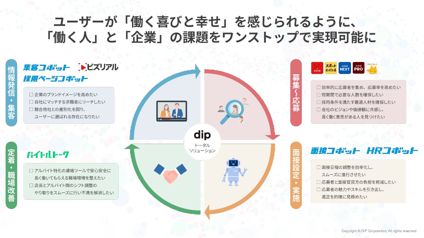Copyright © DIP Corporation, All rights reserved. ユーザーが「働く喜びと幸せ」を感じられるように、 「働く⼈」と「企業」の課題をワンストップで実現可能に