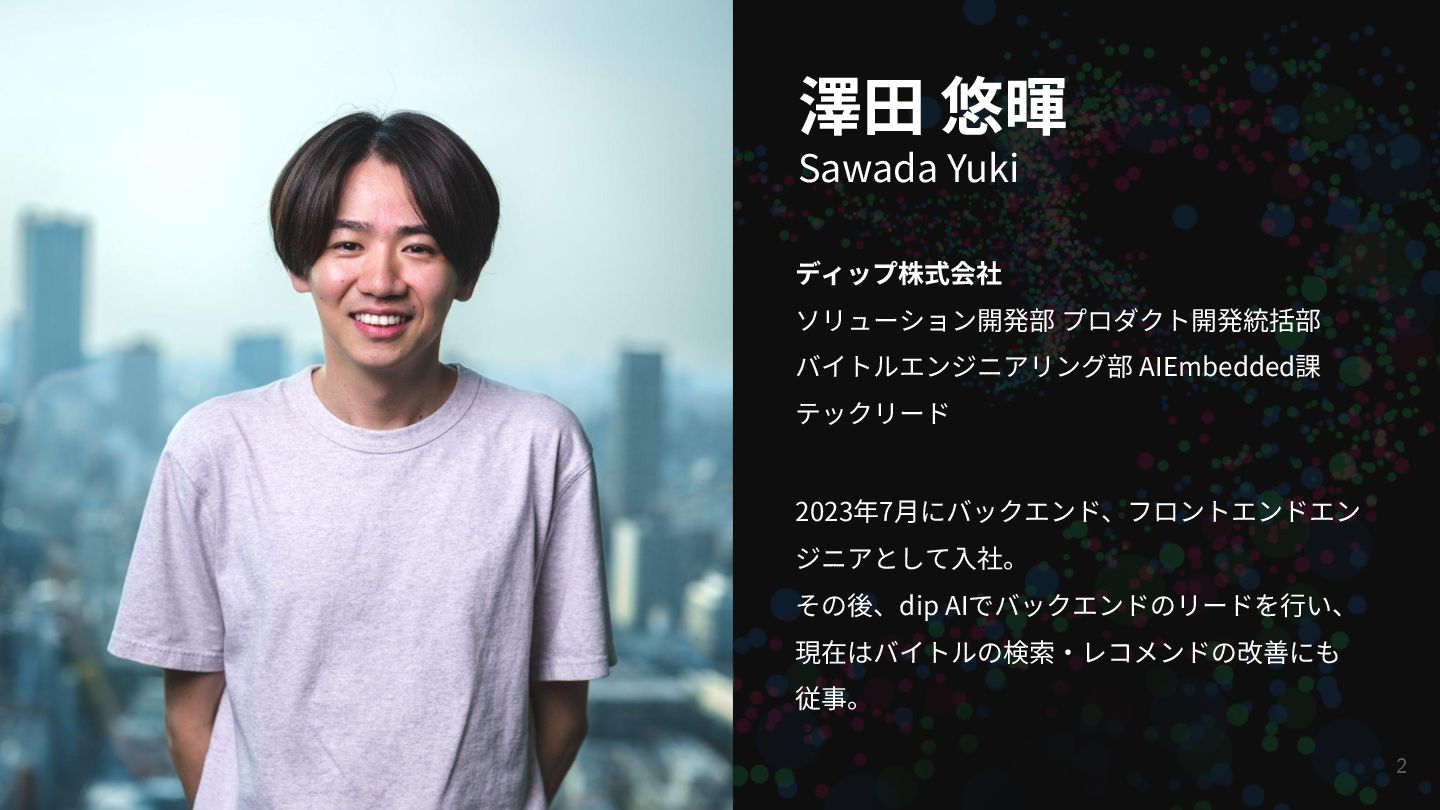 澤⽥ 悠暉 Sawada Yuki ディップ株式会社 ソリューション開発部 プロダクト開発統括部 バイトルエンジニアリング部 AIEmbedded課 テックリード