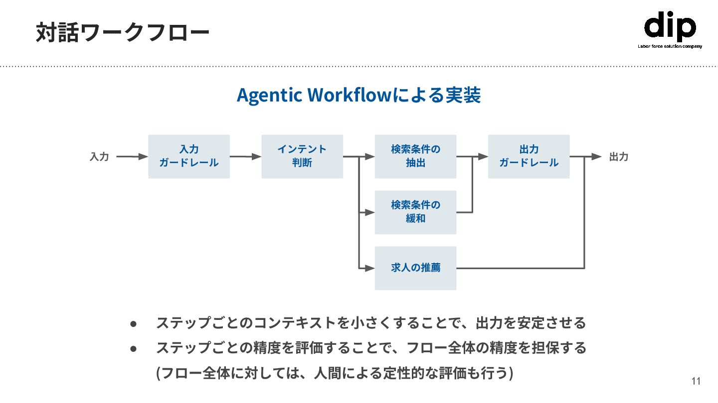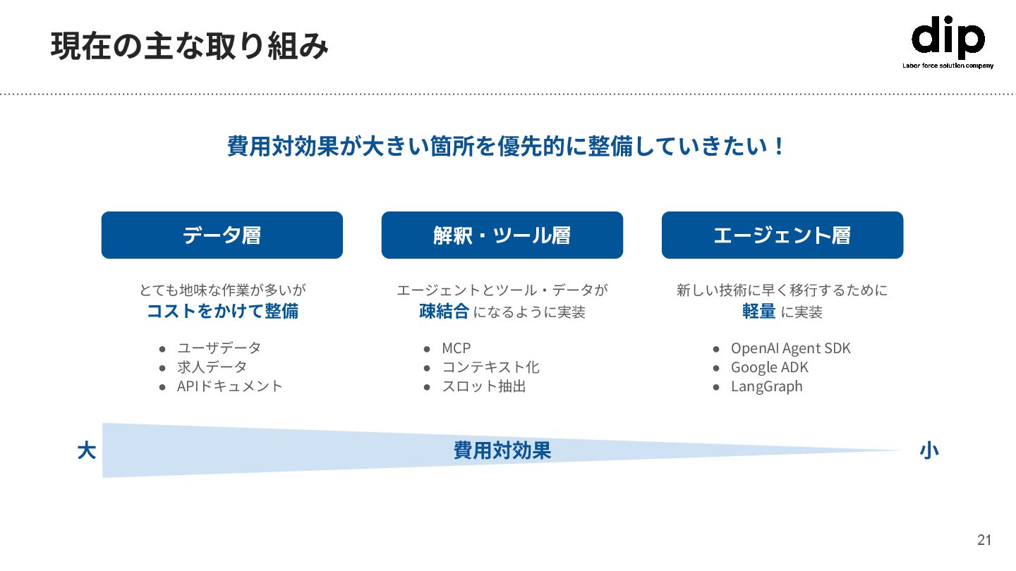 • OpenAI Agent SDK • Google ADK • LangGraph • MCP • コンテキスト化 • スロット抽出 費⽤対効果 ⼩ ⼤ 費⽤対効果が⼤きい箇所を優先的に整備していきたい! データ層 とても地味な作業が多いが コストをかけて整備 • ユーザデータ • 求⼈データ • APIドキュメント