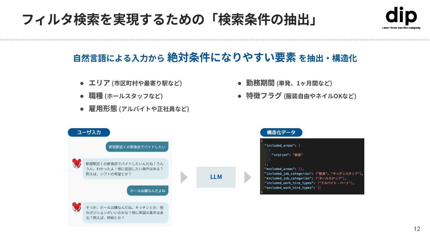 フィルタ検索を実現するための「検索条件の抽出」 ユーザ入力 構造化データ LLM ⾃然⾔語による⼊⼒から 絶対条件になりやすい要素 を抽出‧構造化 12 • エリア