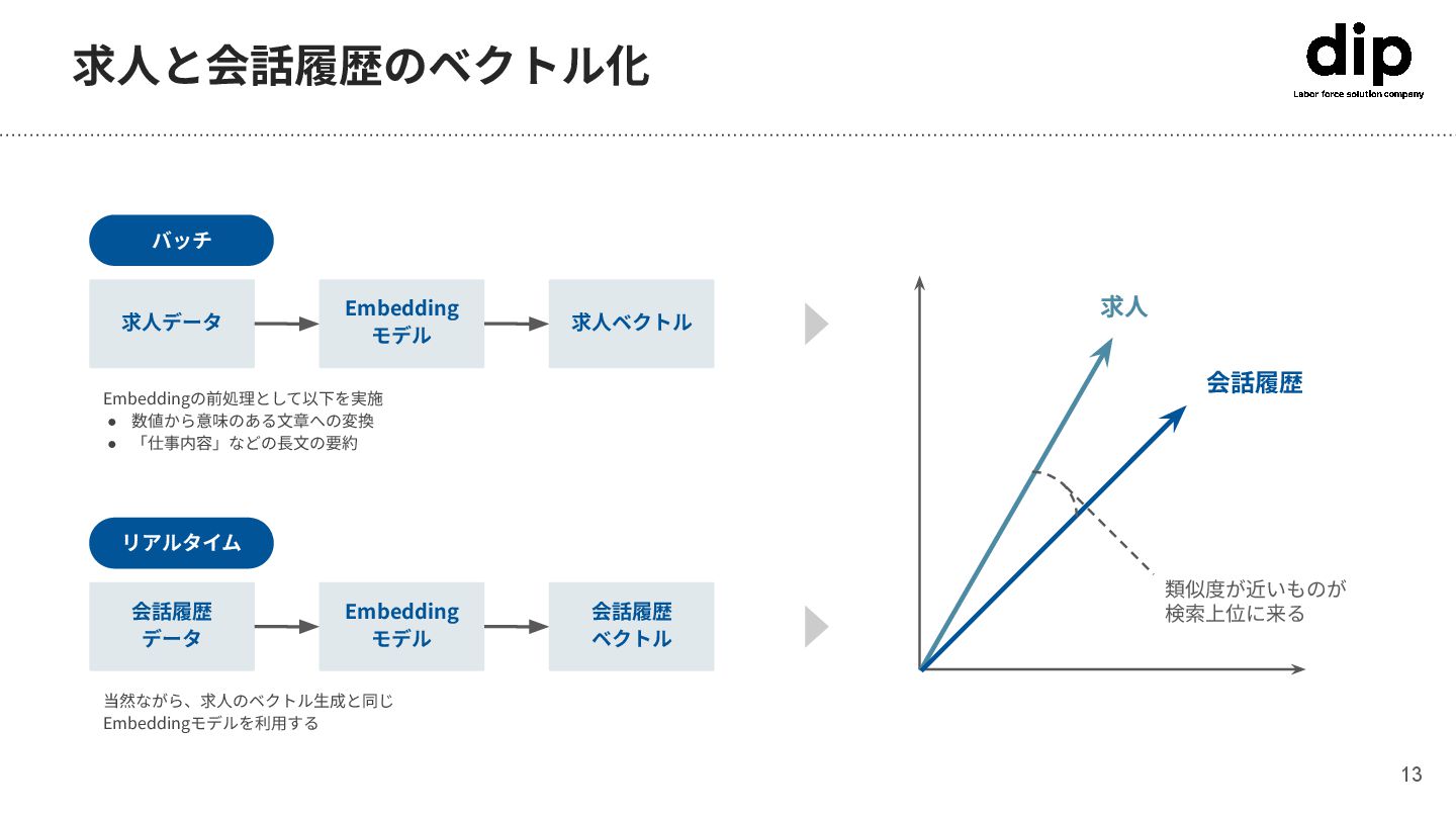 求⼈データ Embeddingの前処理として以下を実施 • 数値から意味のある⽂章への変換 • 「仕事内容」などの⻑⽂の要約 リアルタイム Embedding モデル 会話履歴 ベクトル 会話履歴 データ 当然ながら、求⼈のベクトル⽣成と同じ Embeddingモデルを利⽤する