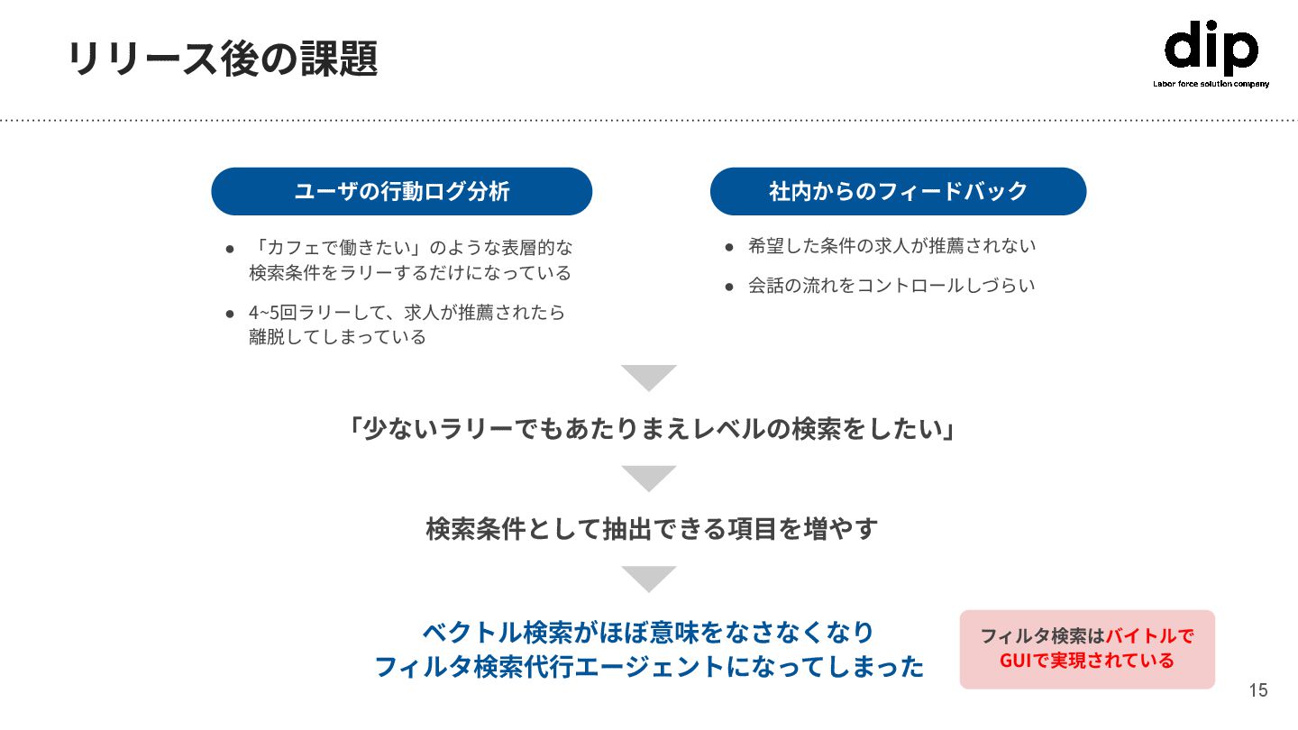 検索条件をラリーするだけになっている • 4~5回ラリーして、求⼈が推薦されたら 離脱してしまっている 「少ないラリーでもあたりまえレベルの検索をしたい」 検索条件として抽出できる項⽬を増やす ベクトル検索がほぼ意味をなさなくなり フィルタ検索代⾏エージェントになってしまった フィルタ検索はバイトルで GUIで実現されている