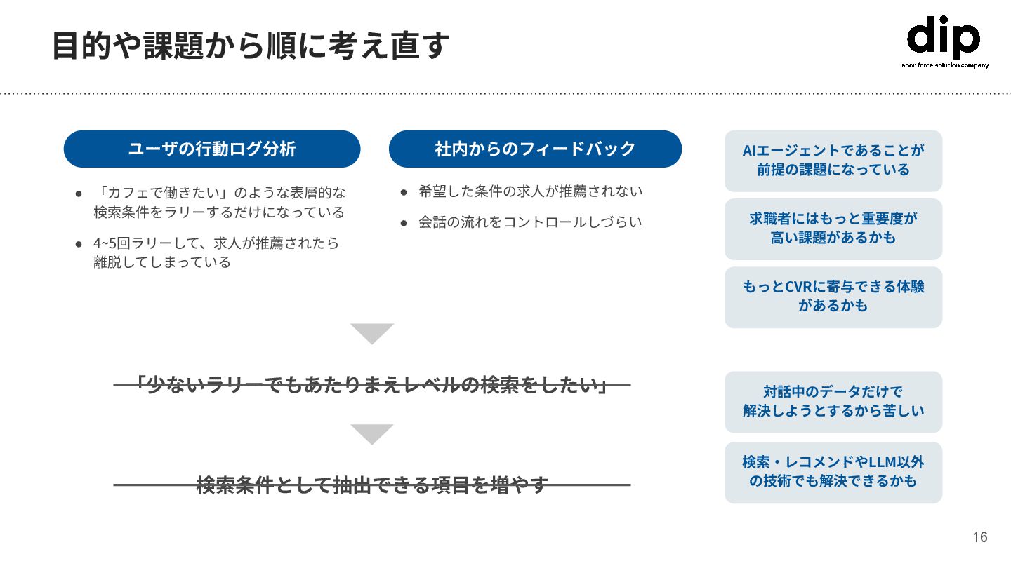 検索条件をラリーするだけになっている • 4~5回ラリーして、求⼈が推薦されたら 離脱してしまっている 「少ないラリーでもあたりまえレベルの検索をしたい」 検索条件として抽出できる項⽬を増やす AIエージェントであることが 前提の課題になっている 対話中のデータだけで 解決しようとするから苦しい 検索‧レコメンドやLLM以外 の技術でも解決できるかも 求職者にはもっと重要度が ⾼い課題があるかも もっとCVRに寄与できる体験 があるかも