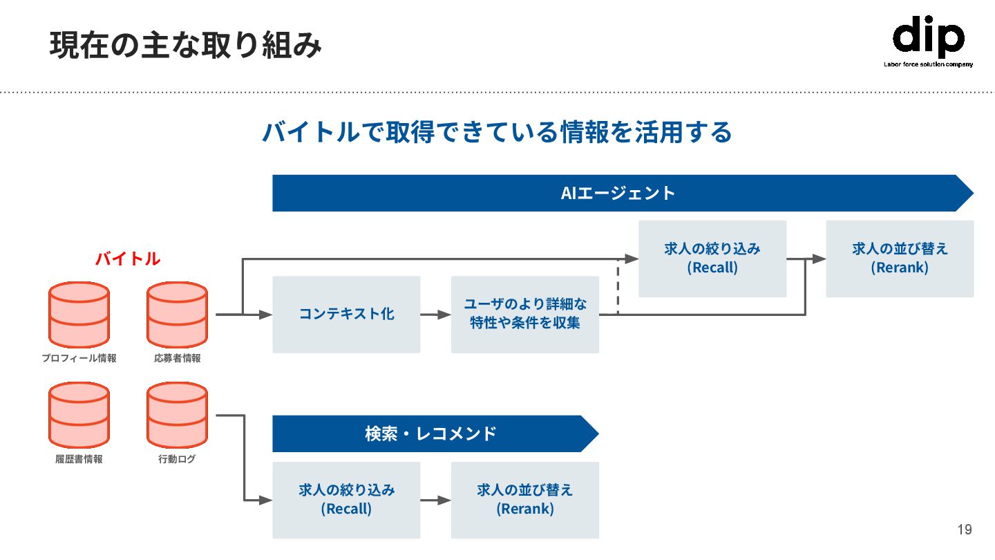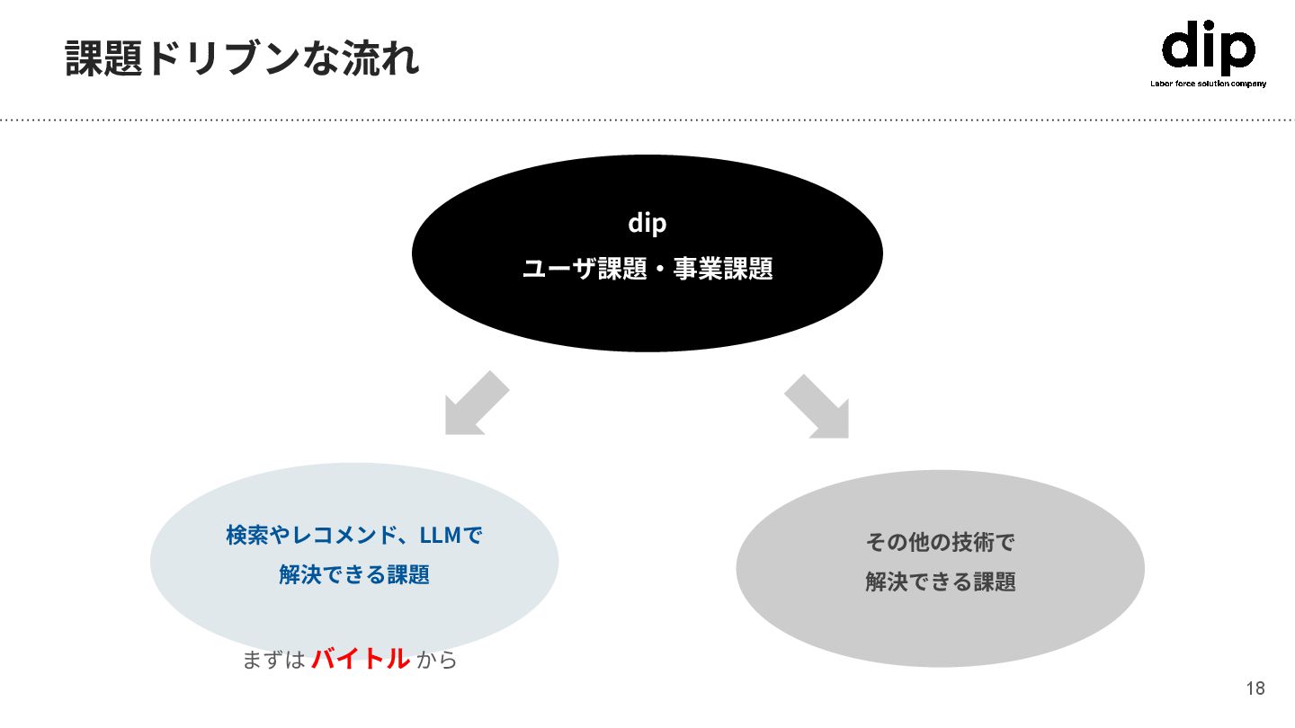 課題ドリブンな流れ 18 dip ユーザ課題‧事業課題 検索やレコメンド、LLMで 解決できる課題 その他の技術で 解決できる課題 まずは バイトル