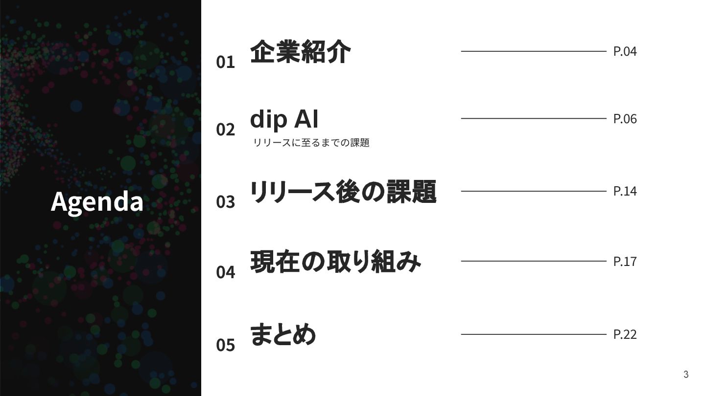 01 企業紹介 P.04 リリースに⾄るまでの課題 02 dip AI P.06 03 リリース後の課題
