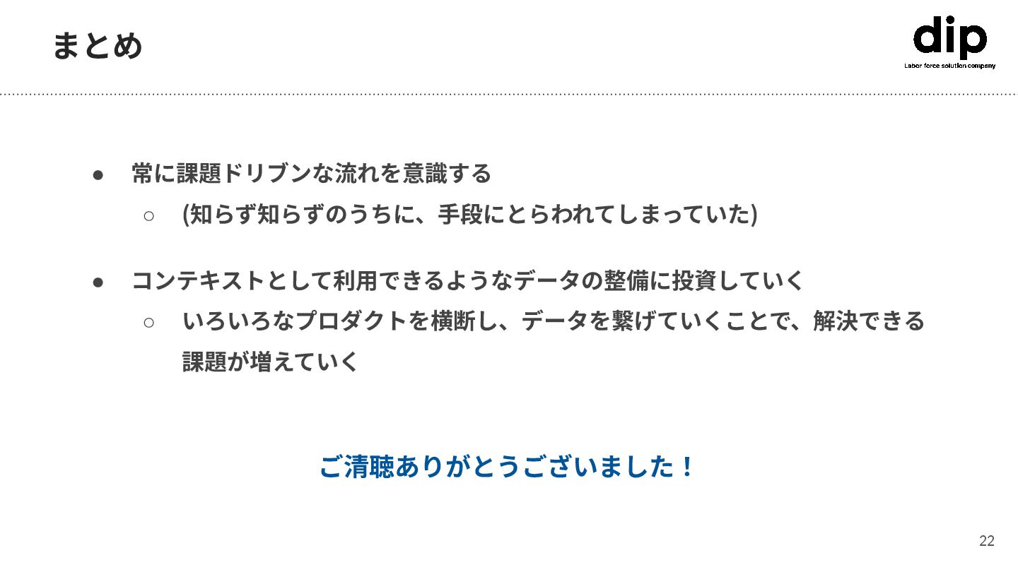 まとめ 22 • 常に課題ドリブンな流れを意識する ◦ (知らず知らずのうちに、⼿段にとらわれてしまっていた) • コンテキストとして利⽤できるようなデータの整備に投資していく ◦ いろいろなプロダクトを横断し、データを繋げていくことで、解決できる