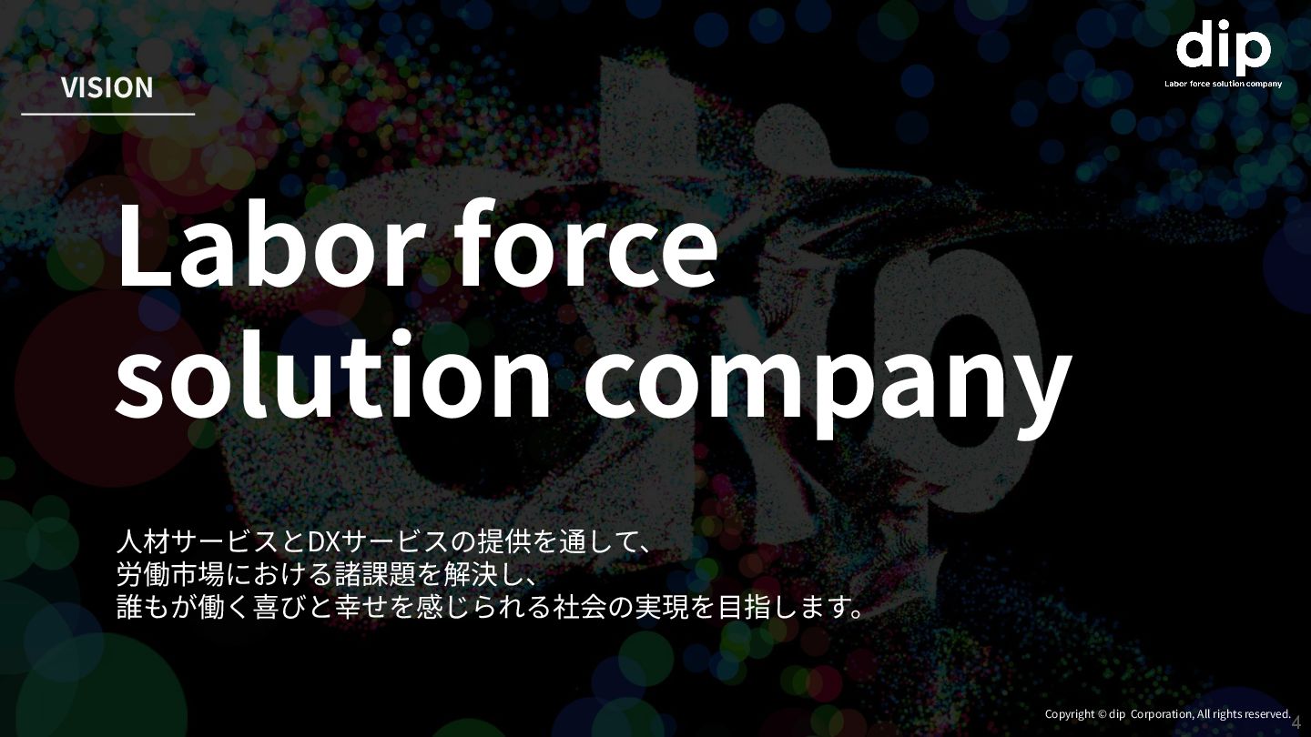VISION Labor force solution company ⼈材サービスとDXサービスの提供を通して、 労働市場における諸課題を解決し、 誰もが働く喜びと幸せを感じられる社会の実現を⽬指します。 Copyright ©